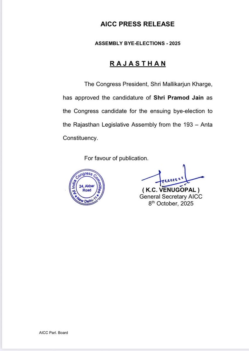 राजस्थान के बारां जिले की अंता विधानसभा सीट पर होने वाले उपचुनाव के लिए कांग्रेस ने एक बार फिर अपने दिग्गज नेता प्रमोद जैन भाया को उम्मीदवार घोषित किया है। बता दें, यह चुनाव न केवल भाया की राजनीतिक वापसी का अवसर है, बल्कि कांग्रेस के लिए 2023 की हार को उलटने का मौका भी है। दूसरी ओर, बीजेपी इस सीट को बचाने के लिए अपनी पूरी ताकत लगा रही है।
